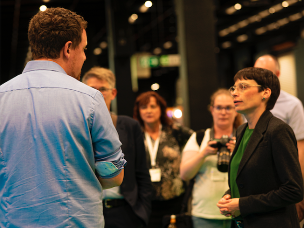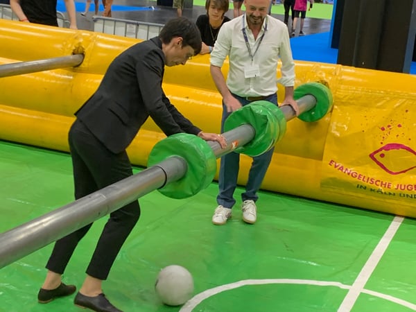 Im Anschluss schaute sich Ministerin Paul den Stand an und trat in einem Menschenkicker-Duell gegen Kolleg:innen aus ihrer Delegation und ehrenamtliche junge Menschen an. Nach einem Grußwort der Ministerin hatten die jungen Menschen die Gelegenheit, Fragen zu stellen. Dabei ging es vorwiegend um die Themen Mobilität, Partizipation und Interesse bzw. Desinteresse junger Menschen an parlamentarischer Politik. Im Gespräch waren dabei auch Steven Edwards, Vorsitzender der AEJ NRW und selbst ehrenamtlich, Peter Bednarz als landespolitischer Referent der AEJ, sowie Daniel Drewes und Julia Körfgen von der Ev. Jugend in Köln und Umgebung.