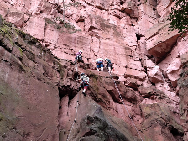Frisch gestärkt mit einer köstlichen Gulaschsuppe, lernten sie am ersten Abend noch die grundlegende Theorie, vom Anlegen der Kletterausrüstung bis hin zu den Grundlagen des Sicherns. Samstags bestand die Möglichkeit, das zuvor erlangte oder vertiefte Wissen am Hohenstein direkt beim Toprope- oder Vorstiegsklettern am Fels anzuwenden. So wurden im Laufe des Tages verschiedene Routen erklommen oder der Sicherungspartner beim Klettern gesichert. Das Kochteam bereitete währenddessen ein weiteres Highlight vor, das abendliche Grillen. Am Sonntag bestand zusätzlich die Möglichkeit, im Steinbruch bei Hainstadt einen Klettersteig zu begehen und das Abseilen am Fels zu üben. Nach einem erfolgreichen Wochenende hatten vier Kletternde zusätzlich ein Toprope- oder Vorstiegsschein des Deutschen Alpenvereins erlangt.