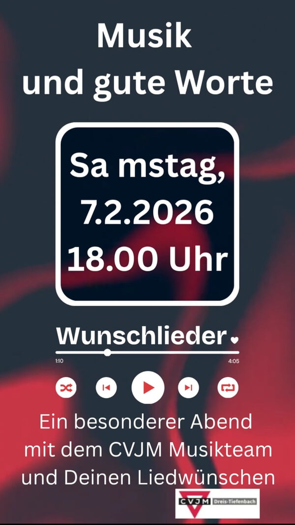 Das CVJM Musikteam freut sich darauf, Eure Wunschlieder einzuüben und dann am 7. Februar zu Gehör zu bringen. Daher teilt gern bis zum 26. Januar 2026 Eure Musikwünsche mit – am besten einfach per Email an britta.herwig@gmx.de.