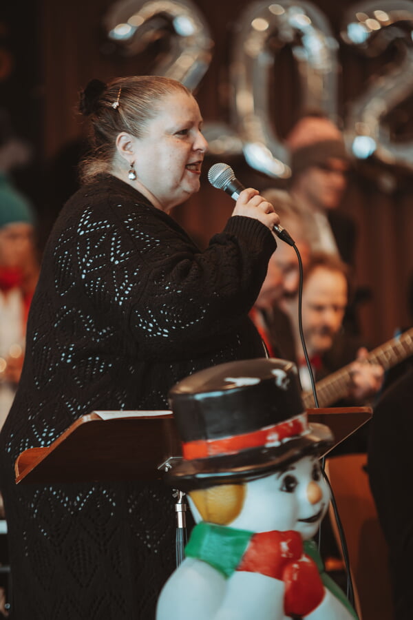 Der schwungvolle Auftritt des Dirigenten Manuel Galemann machte deutlich, dass nun Swing-, Rock- und Pop-Titel angesagt waren. Auch er musste sich gefallen lassen, dass man ihm passend zu dem von ihm arrangierten James-Bond-Melodien einen Martini reichte, natürlich geschüttelt, nicht gerührt. So reihten sich die Musiktitel aneinander, mal mit einem Saxofon-Solo von Micha während des Lady-Gaga-Songs „Die With A Smile“ und zum Schluss mit dem bekannten Winterlied, passend zum Wetter, „Let It Snow“, interpretiert von der Sängerin Ulla, die zuvor schon bei den Bond-Melodien mitgewirkt hatte. Stefan, der Mann für special effects, hatte es sich nicht nehmen lassen, dazu einen beleuchteten Schneemann auf der Bühne zu präsentieren. Da wurde es den Bläserinnen und Bläsern auf den hinteren Stehplätzen plötzlich so kalt, dass sie ihre Pudelmützen aufsetzen mussten.