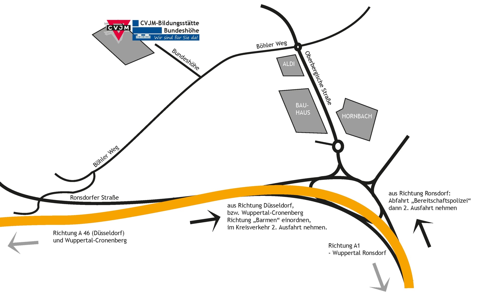- Hinweis für Fahrer mit Navigationssystem: Aus Richtung A43 oder A1 bitte immer bis Ausfahrt Ronsdorf fahren, nie einer evtl. Empfehlung über die A46, Abfahrt Barmen folgen, da manche Navigationssysteme Sie dann über den Böhler Weg zu uns führen. Die Straße ist aber offiziell vom Tal aus bis zur Hausnummer 12 für die Durchfahrt gesperrt!
